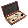 Personalizowany zestaw do wina składający się z korkociągu, 2 zatyczek (jedna z funkcją nalewaka), obrączki na szyjkę butelki zabezpieczającej przed kapaniem. Taki prezent będzie nie tylko ciekawy, ale również przydatny każdej osobie, która lubi wina. Całość jest zapakowana w eleganckie drewniane pudełko.